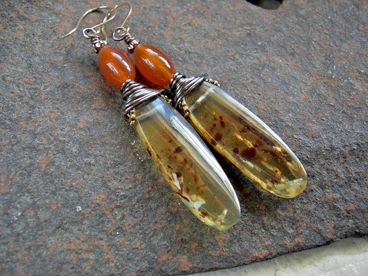 Smoky Sun Earrings, Dominican Amber Tabs, Carnelian, Copper