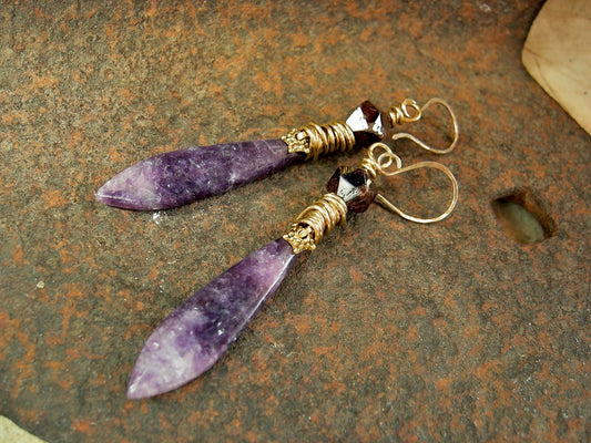 Purple Petal Earrings, Lepidolite Tabs, Faceted Dark Garnet