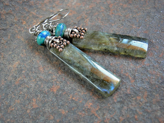 Elegant Labradorite Tab Earrings, Hand Cut Stone, Blue Green