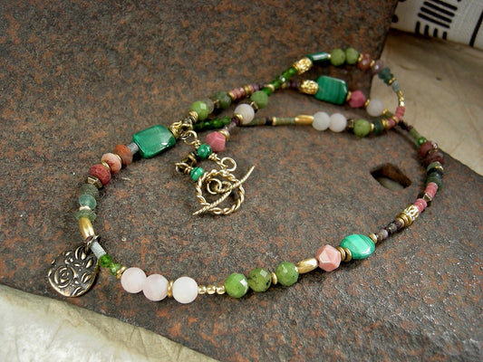 Rose Garden Wrap Bracelet/Necklace, Pink & Green Gemstone, 22kt Gold