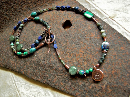 Lotus Pond Wrap Bracelet/Necklace, Green & Blue Gemstone, Copper Lotus