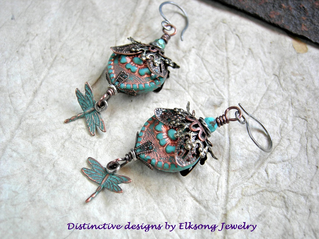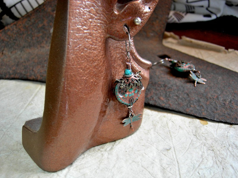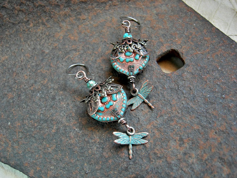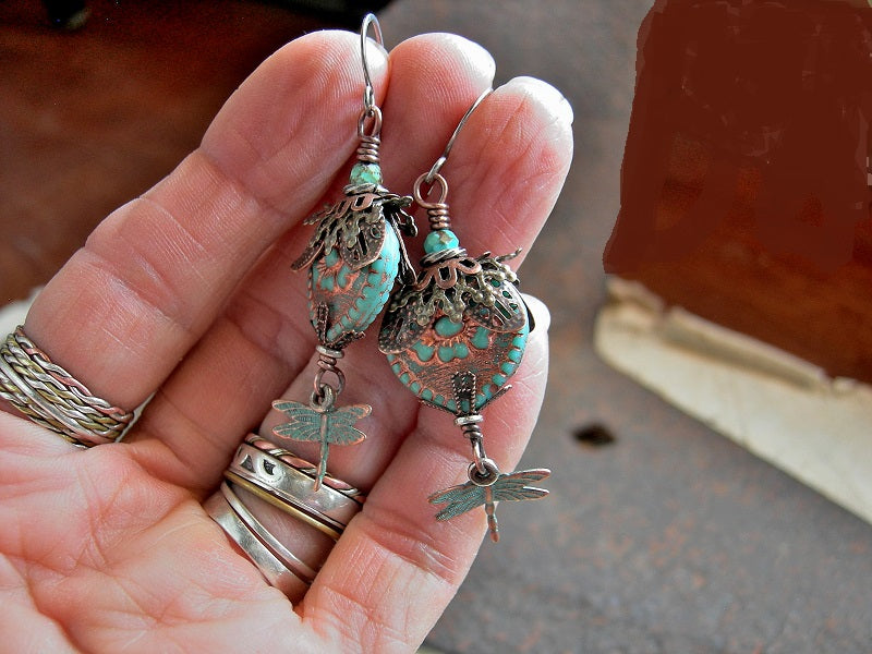 Detailed earrings full of vintage boho charm, these aqua lovelies feature glass heart beads, layered filigree & dainty little dragonfly charms. The Czech glass hearts are embossed with flowers & have a coppery wash....antiqued copper & brass stamped filigree enfold them below & above. At the tops, rounds of faceted turquoise add a little sparkle & at the bottoms, sweet little verdigris copper dragonflies dance.