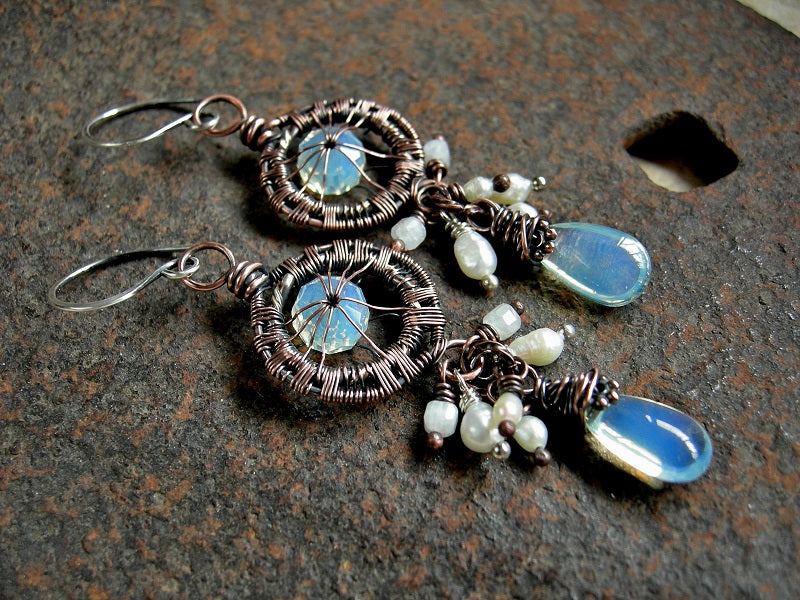 As luminous as moonlight, these copper wire wrap cluster style earrings just glow! They feature faceted opalite disc beads held in double rings with delicate, oxidized copper wire wrapping. Below, clusters of vintage Japanese freshwater rice pearls & faceted white moonstone cubes are gathered over copper wire wrapped teardrops of more gleaming opalite.